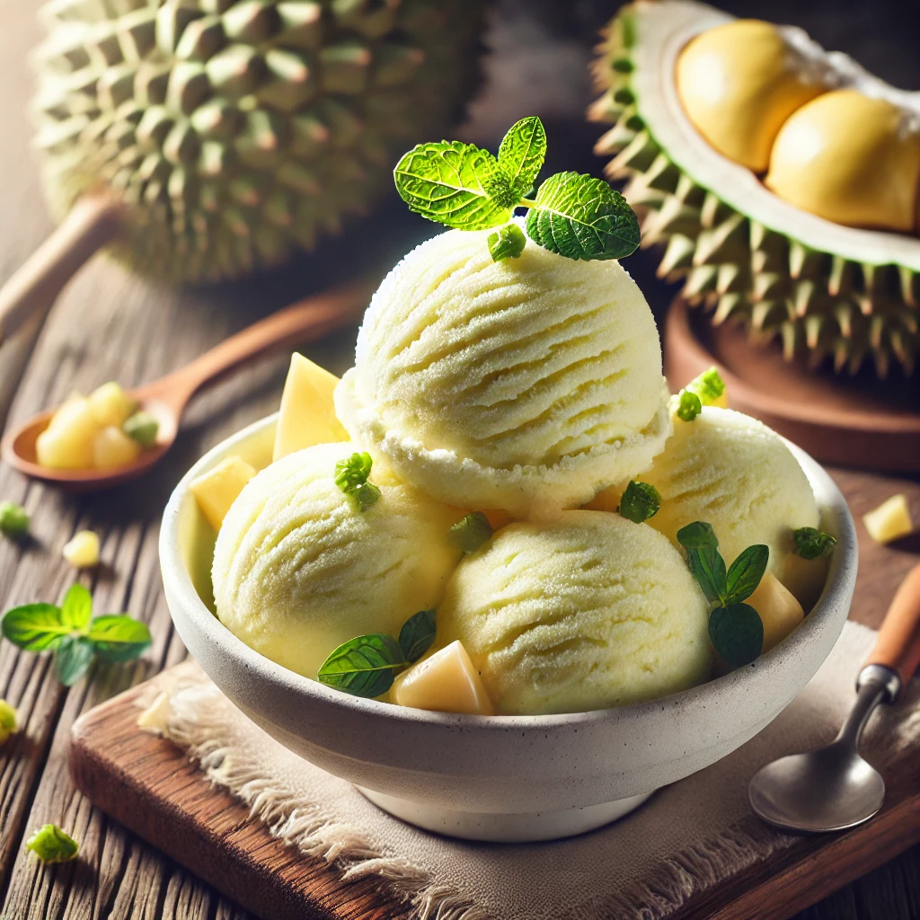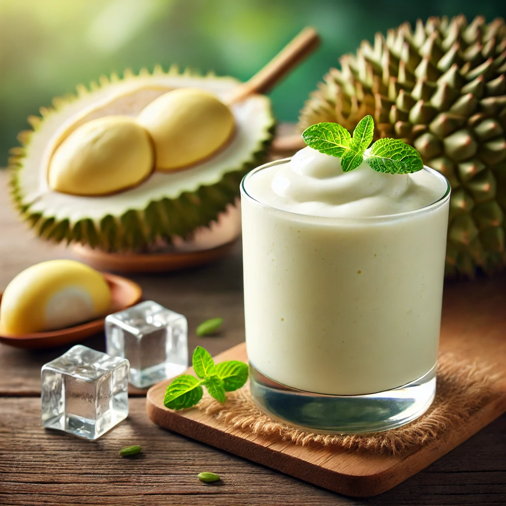 두리안을 우유, 연유, 얼음과 함께 블렌더에 갈아 스무디로 만들면 특유의 진한 맛을 즐길 수 있습니다. - 두리안 아이스크림