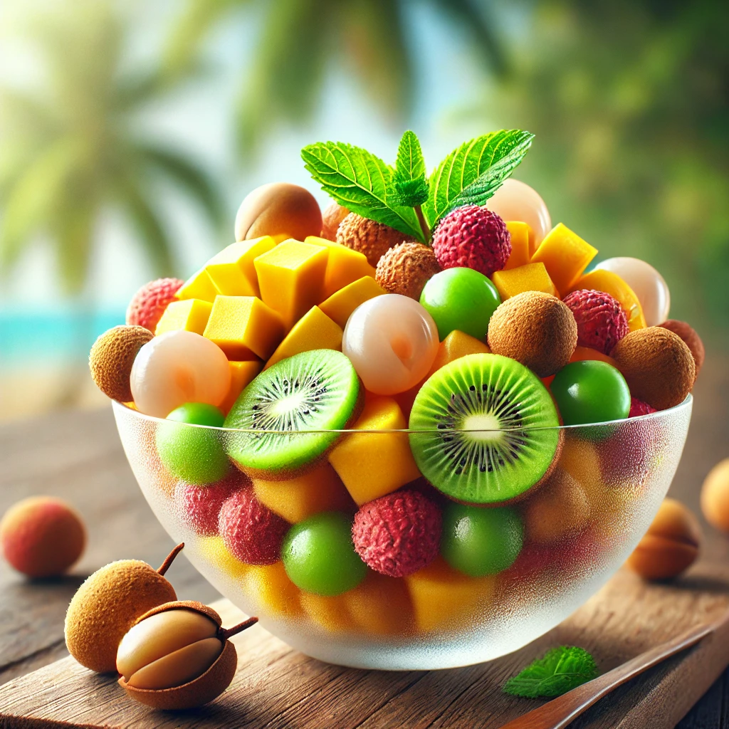 신선한 용안을 블렌더에 갈아 스무디로 만들거나, 코코넛 밀크와 함께 섞어 열대풍 음료로 즐길 수 있습니다. - 샐러드 토핑