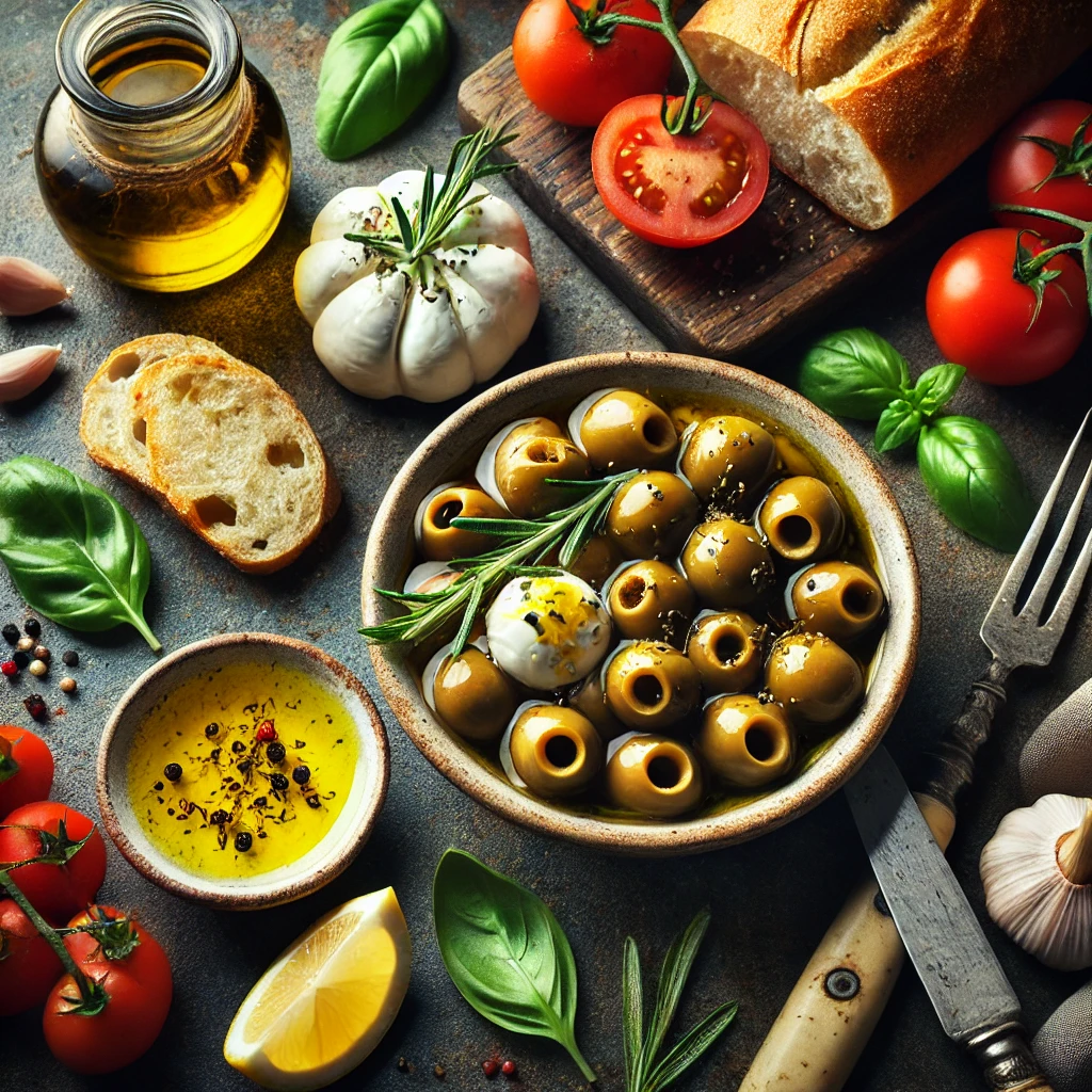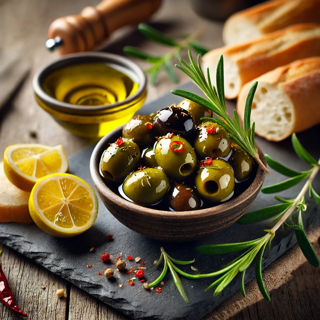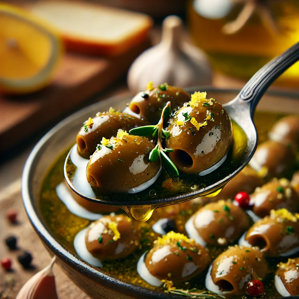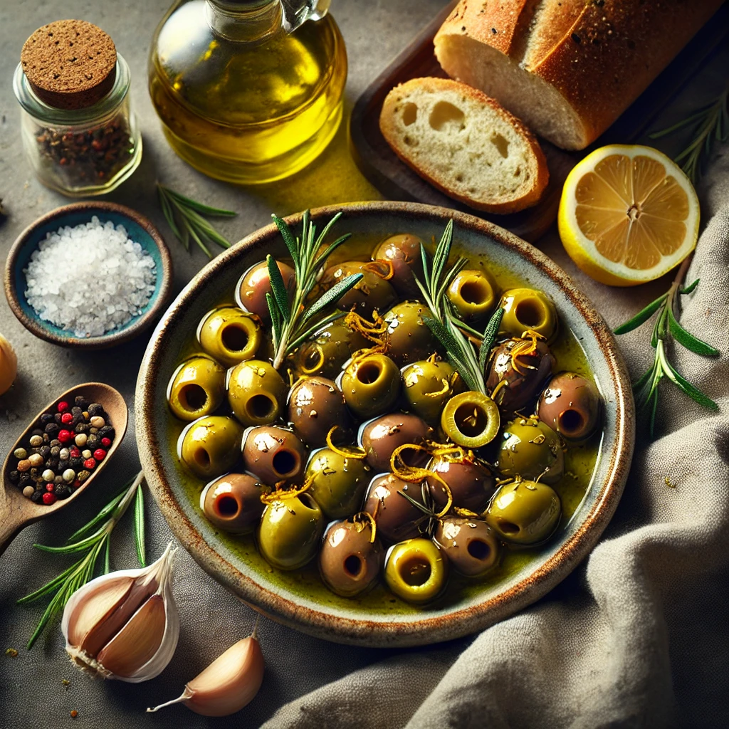 엑스트라 버진 올리브 오일, 마늘, 허브, 레몬즙은 필수입니다.올리브 조림을 기름 없이 만들 수 있나요?