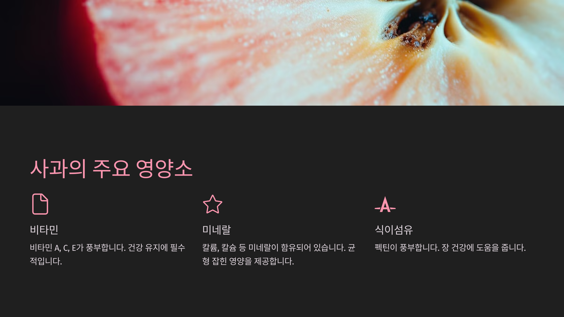 사과를 활용한 음료도 인기가 많아요. '사과주스'나 '사과와 민트를 넣은 아이스티' 같은 음료는 무더운 여름날에 시원하게 즐기기 딱 좋아요. 사과의 자연스러운 단맛 나의 말: 네네 ChatGPT의 말: html 복사