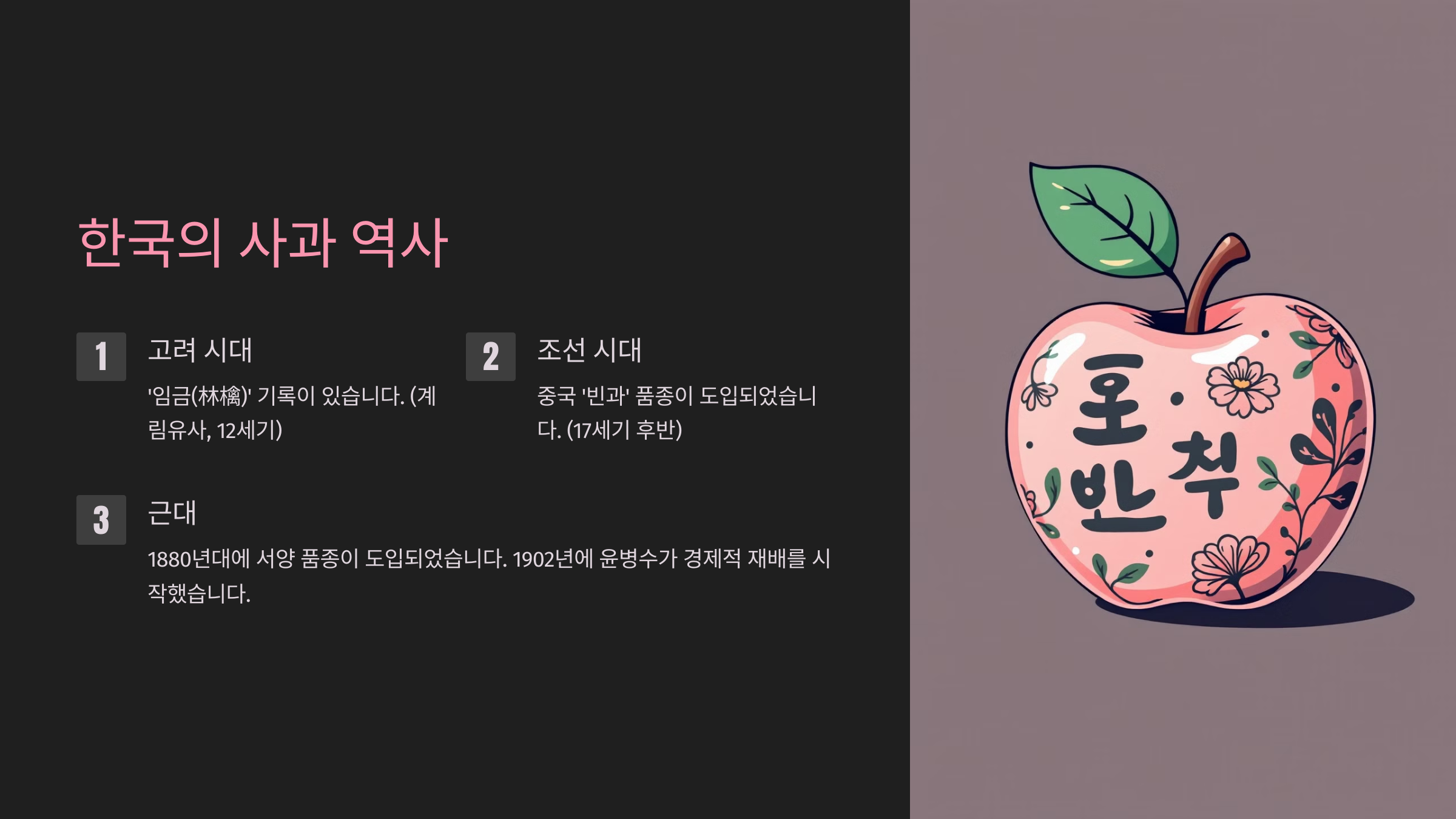 사과는 약 4000년 전 중앙아시아에서 시작된 과일로, 인류 역사와 깊게 연결된 중요한 작물이에요. 카자흐스탄 알마티 지역이 그 기원지로 알려져 있으며, 알마티는 '사과의 땅'이라는 뜻을 가지고 있어요. 이곳의 야생 사과는 오늘날 우리가 먹는 사과의 조상이 되었답니다.