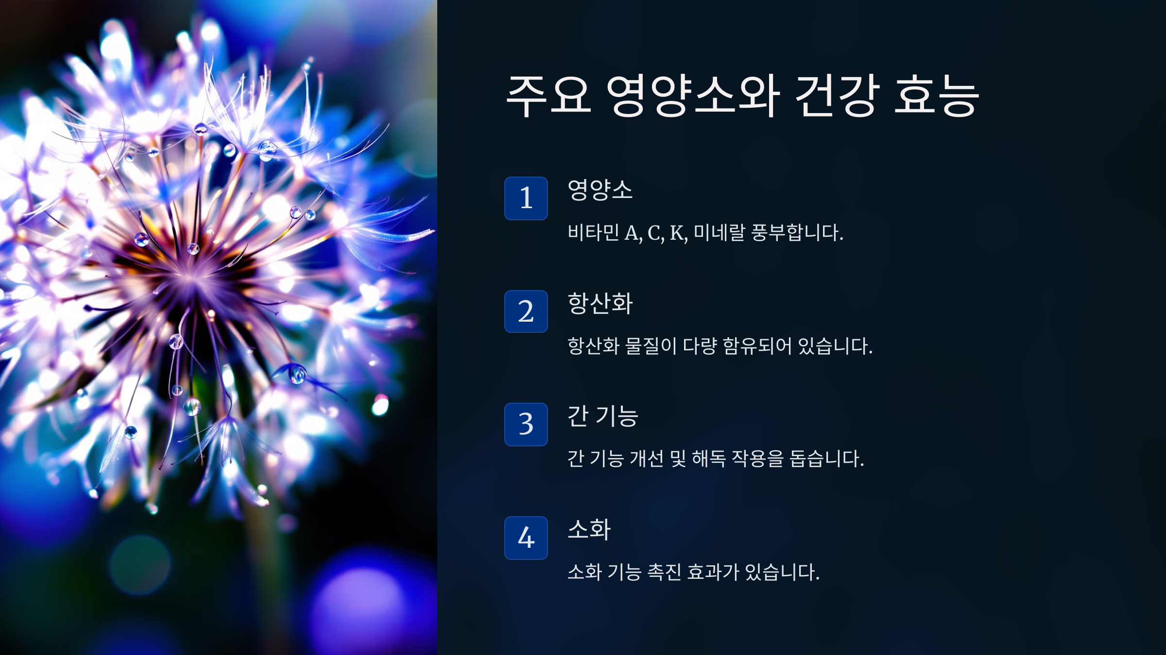 한의학에서는 민들레를 ‘포공영(蒲公英)’이라고 부르며, 해열, 해독, 소화 촉진 등의 목적으로 사용했어요. 서양에서도 면역력을 높이는 허브로 많이 활용된답니다.
