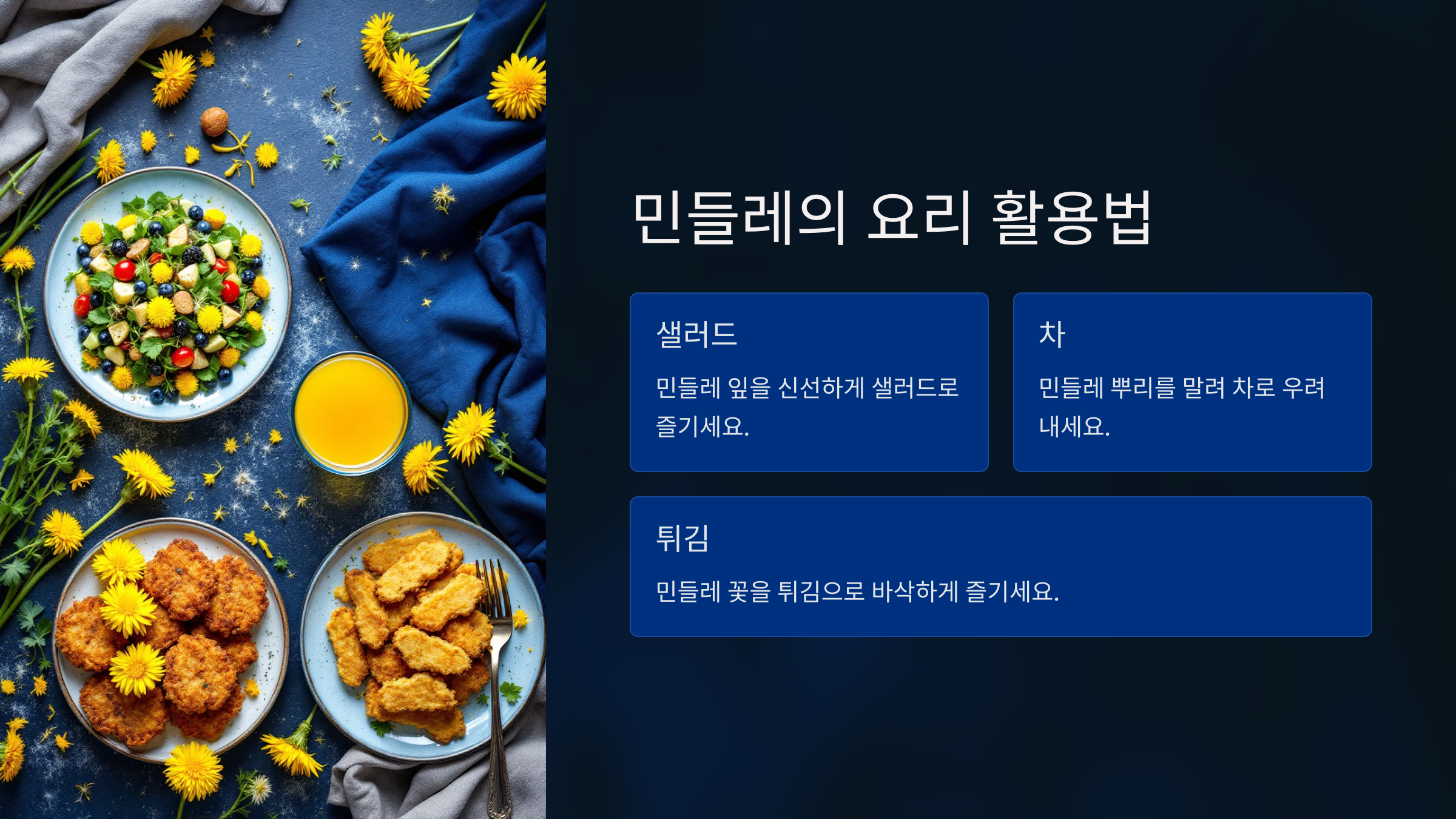 그럼 민들레를 활용한 대표적인 요리법을 살펴볼까요? 😊